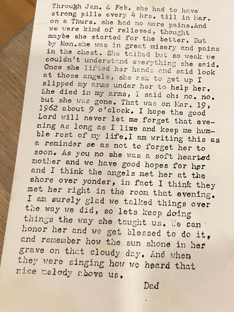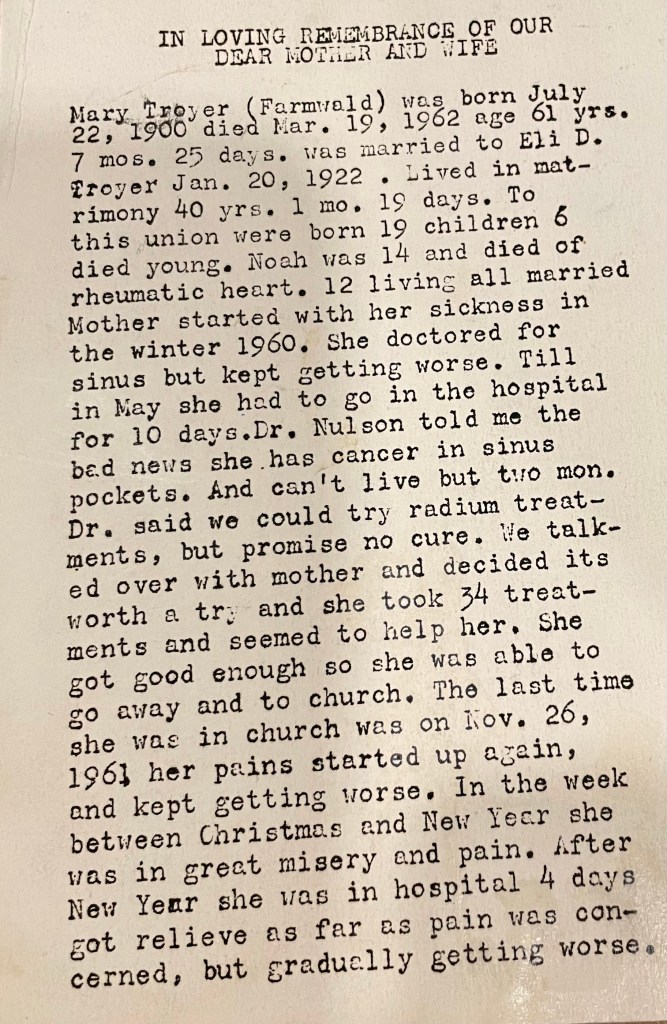 Above are the writings of Eli after Mary passed away. This card he sent to each of his children in recollection of her life.